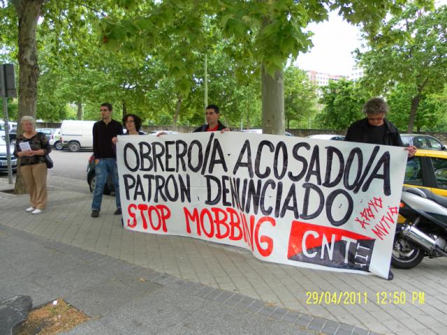 El pasado 29 de abril militantes del Sindicato de Enseñanza y de Oficios Varios de la CNT-AIT madrileña se concentraron ante las oficinas centrales que Atento tiene en la Avda. de la Ilustración - Madrid. El motivo de dicha concentración-piquete era informar tanto a los “jefes” como a lxs trabajadorxs de Atento la situación que se vive en Barcelona (servicio del 061 en el centro de la calle motores), denunciando el acoso laboral – mobbing que está realizando la empresa hacia los/as trabajadoras.