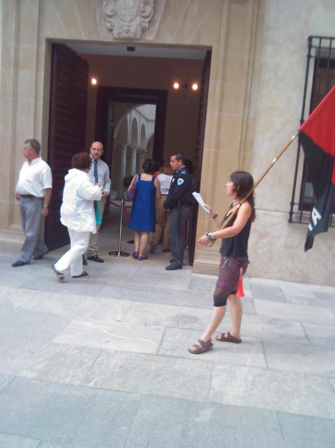 Durante la concentración se repartieron panfletos tanto a los/as participantes en las Jornadas FESABID como a los viandantes que se paraban a escuchar el comunicado y mostraban su interés por el conflicto. Para finalizar, se concluyó tocando el himno de "A las Barricadas" con el que todos/as nos sentimos identificados/as.