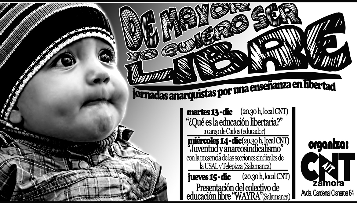 Estos compañer@s nos indicarán, en qué consiste y como están organizando este programa de educación libertaria. Se defienen como "un grupo de personas que creemos en una educación basada en la libertad y el respeto a l@s niñ@s. Con este planteamiento estamos desarrollando un proyecto para crear un espacio de educación libre en Salamanca."