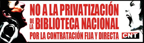 En septiembre de 2010, la CNT de Madrid inició un conflicto contra la Dirección de la Biblioteca Nacional por sus prácticas de cesión ilegal hacia los/as más de 400 trabajadores/as subcontratados/as, que están siendo represaliados/as y despedido/as por denunciar su situación de precariedad laboral. Nuestras compañeras Begoña y Sara – del Departamento de Música – y nuestra compañera Marta – del Área de Relaciones Institucionales – fueron las primeras represaliadas por denunciar su situación de contratación irregular, habiendo sido despedidas y trasladadas a las oficinas de la empresa INDRA donde todavía permanecen secuestradas hasta la resolución del proceso judicial.