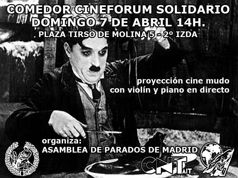 El domingo 7 de abril la Asamblea de Parados de la Federación Local de la CNT-AIT de Madrid realiza un Comedor-Cine-Forum. (Cine mudo ambientado con violín y piano en directo).