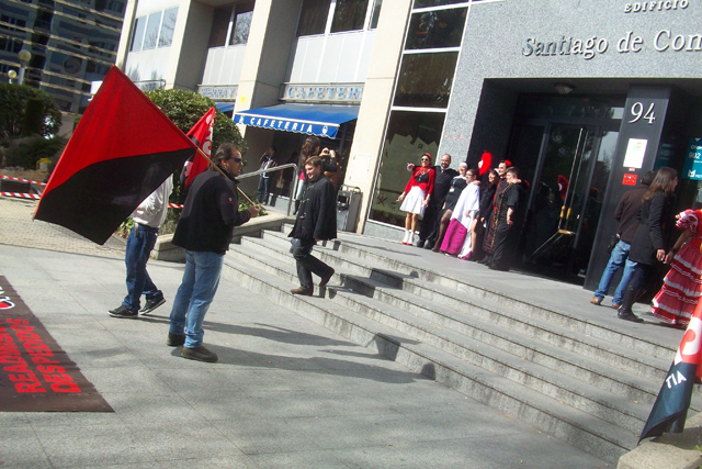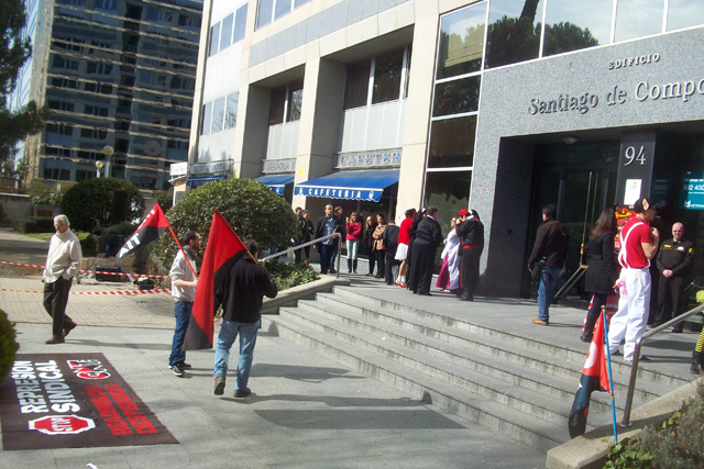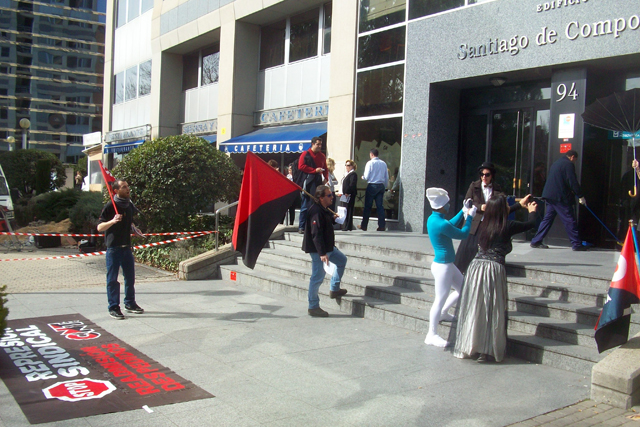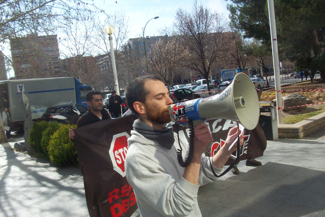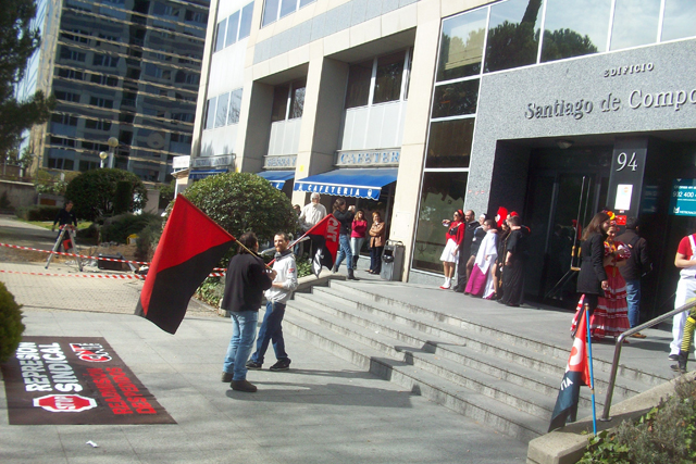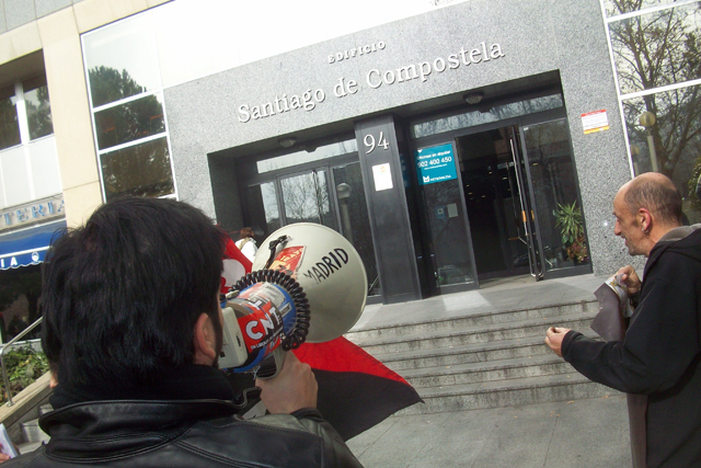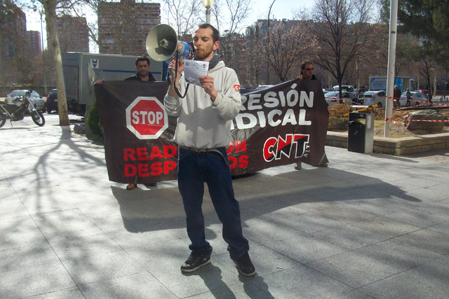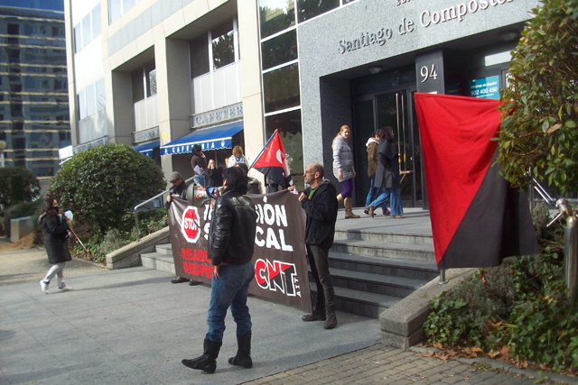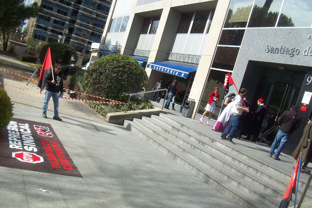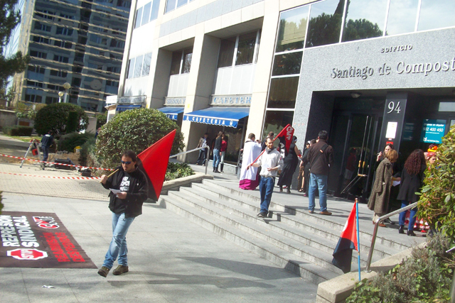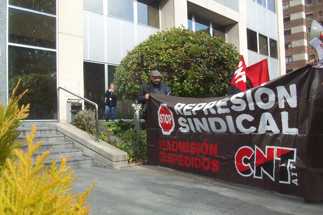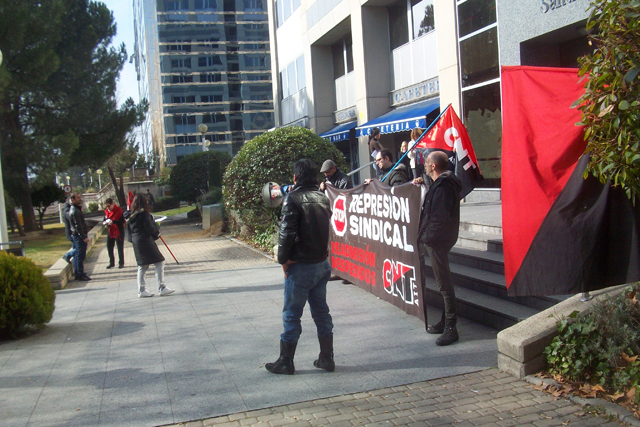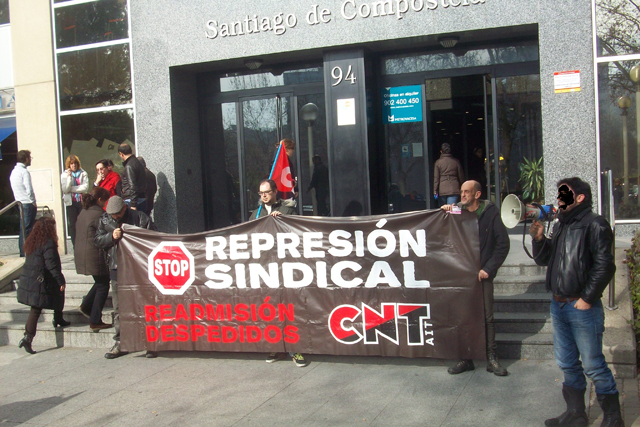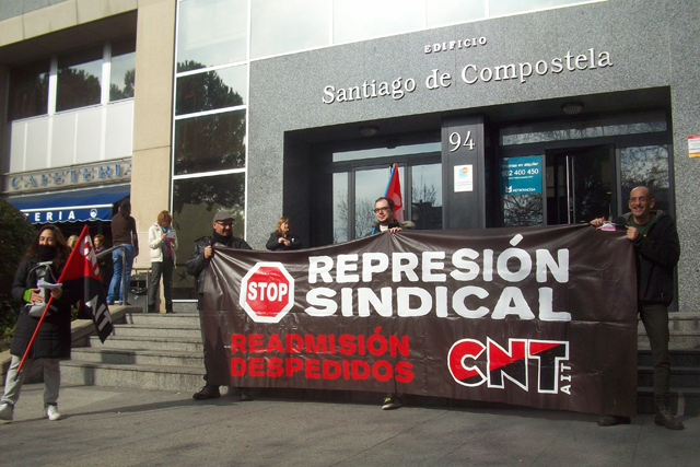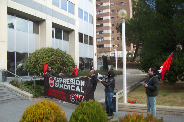 Militantes del Sindicato de Oficios Varios de Madrid se están concentrando a las puertas de Atento en el centro que tiene esta empresa en Ilustración en apoyo a la convocatoria planteada por la Sección Sindical de CNT-AIT de Madrid, dentro de la "Campaña de Lucha Contra la Represión Sindical".
