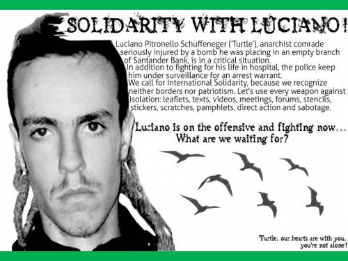 Reconocemos nuestras diferencias como individuos, pero estas no son limitancias para reconocernos como compañeros de lucha, incluso sin conocernos los unos a los otros, el amor a la libertad nos une y son las diferencias entre nosotros las que nos fortalecen. Es por eso que hacemos el llamado a solidarizar con el compañero Luciano/Tortuga. A no caer en el miedo que quiere imponer el Poder para aislar al compañero. El hecho de que un compañero anarquista haya resultado herido, este preso y enfrentando un proceso judicial es razón suficiente para apoyarlo y no dejarlo solo. No nos quedaremos impávidos mientras hacen de la tragedia un espectáculo, mostrándose como clara venganza contra quien ven como el rostro visible tras años de resistencia y ofensiva antiautoritaria. Tampoco olvidamos el apoyo que antiguos prisioneros políticos recibieron en años anteriores, quienes estaban condenados por ajusticiamientos, expropiaciones o ataques explosivos, lo cual no fue impedimento para que personas consientes apoyaran las movilizaciones que permitieron que lxs compañerxs salieran a la calle, como un ejemplo valioso de lucha. Que estas palabras de amor y libertad traspasen muros y rejas para llegar hasta Luciano y sus cercanos en este difícil momento. Compañero nuestros pensamientos están contigo, te enviemos nuestra fuerza para que sigas firme ante el enemigo, porque en la guerra social nadie esta solx, hacemos de la solidaridad nuestra mejor arma. Con todxs lxs compañerxs caídxs en combate en la memoria, para ellos nuestro mejor homenaje es seguir luchando.