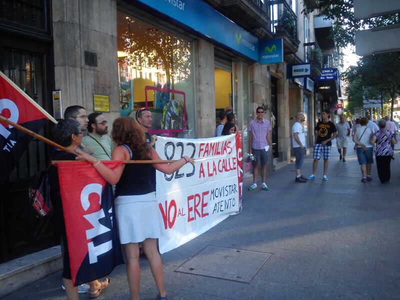 El pasado 30 de julio una docena de compañeros y compañeras realizaron una concentración a las puertas del establecimiento que Movistar tiene en la céntrica Plaza España de Salamanca. El motivo de la concentración era apoyar a las Secciones Sindicales de CNT en Atento que están en lucha contra el ERE que va a realizar la empresa, dejando en la calle a 800 familias.