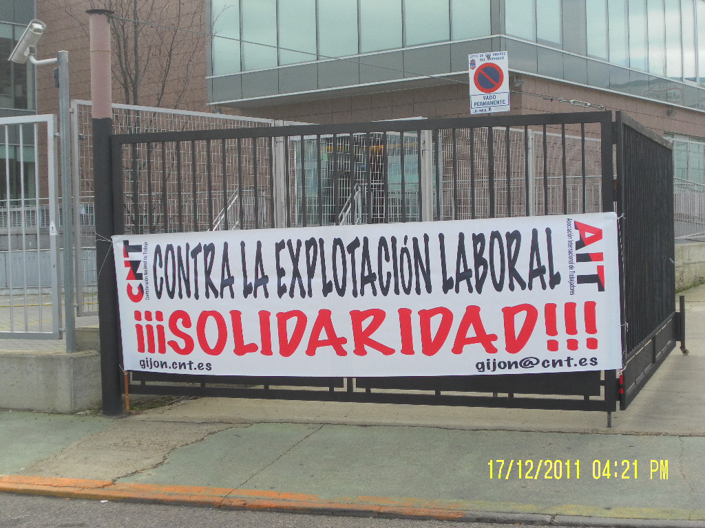 Todo trascurrió con normalidad plena, salvo la intervención de un "heredero de la empresa". Siempre en este tipo de acciones aparece el típico oportunista que trata de acallar la libertad de expresión; del interior del edificio salió "Romero, el portero madero" a informar a lxs concentradxs que no se podían manifestar en fin de semana, argumentando lo que ya sabíamos de antemano. Sus palabras fueron, los sindicatos solo se manifiestan de lunes a viernes; a lo que con risas contestamos que la CNT protesta los 7 días de la semana. Sin duda alguna la primera impresión que nos dio aquel individuo de metro y medio fue la de un pretendiente de madero frustrado, "tal vez no pasó las pruebas por la talla", cuando Romero volvía a su perrera observamos que a su espalda llevaba "grilletes", para que?, en un centro se supone de trabajo. Romero cogió su teléfono y llamó tanto a la policía nacional como a la municipal, quienes "olímpicamente pasaron". En fin las conclusiones de este "esquirol y vendío" las sacáis vosotrx