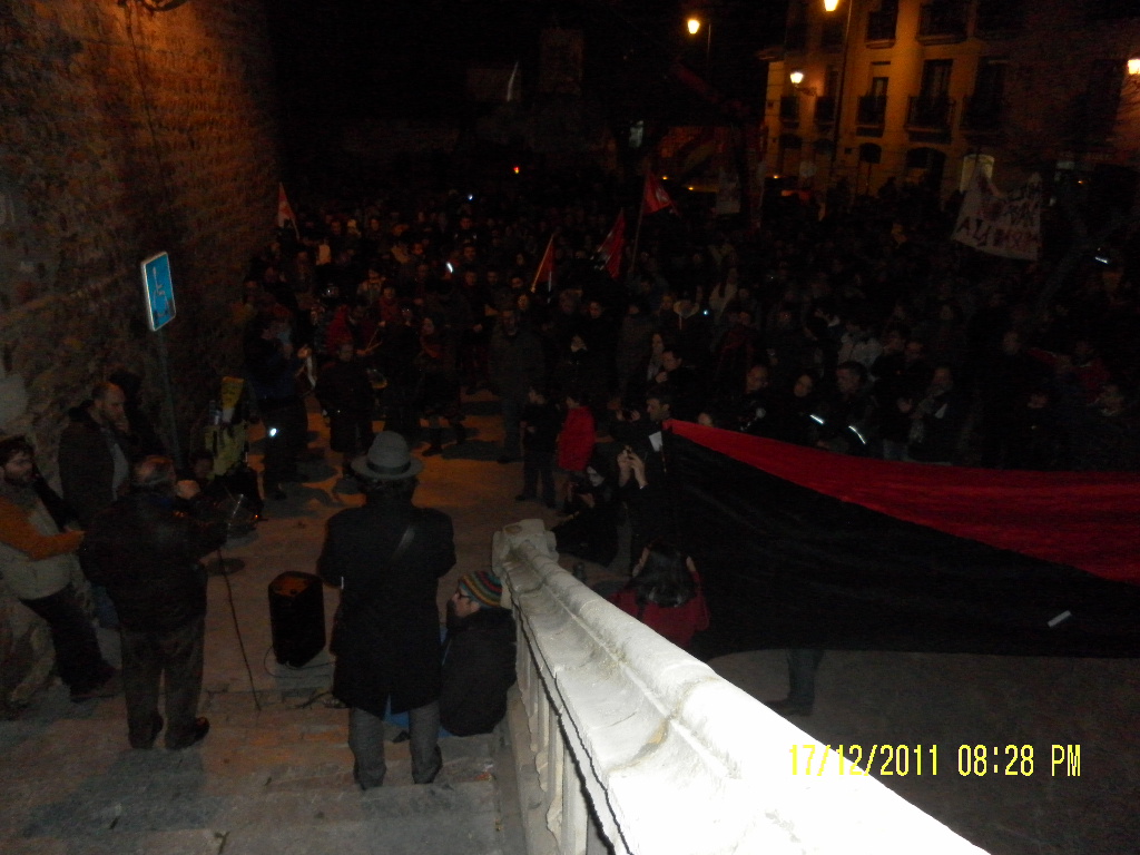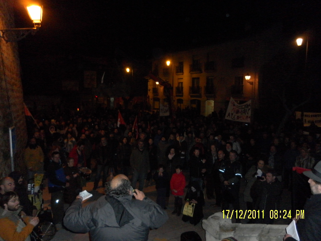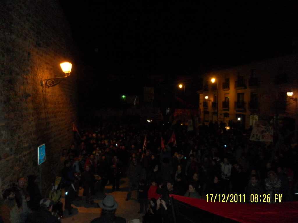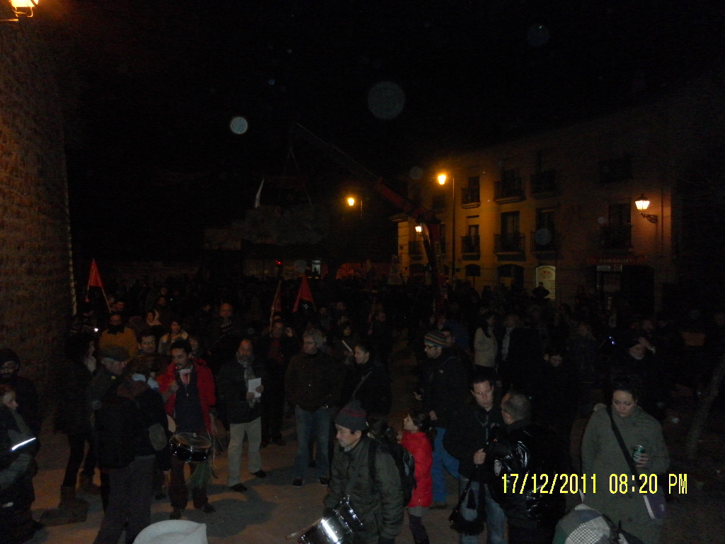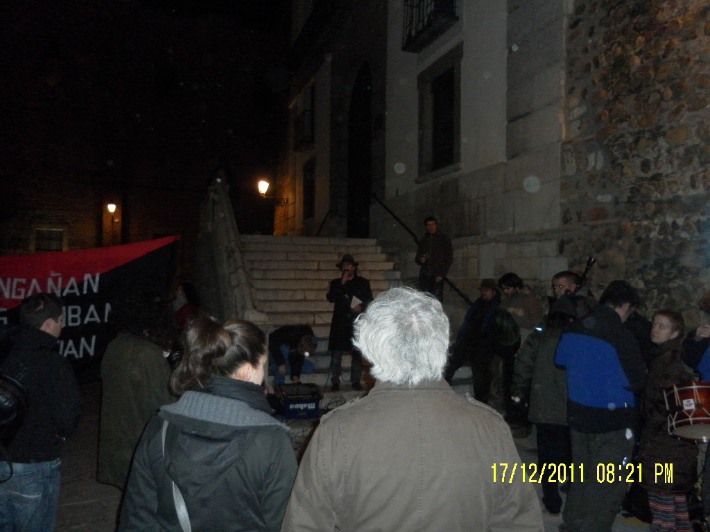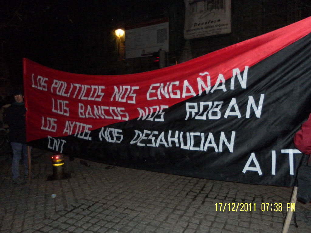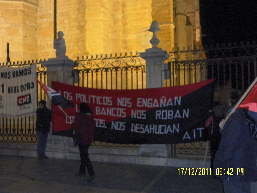La manifestación comenzó a las 18:30 horas con intervenciones de compañerxs tanto de la CNT como del CCAN; continuó con la escenificación de acciones donde participaban todxs lxs asistentes. Terminado todo este prólogo lxs asistentes recorrieron las calles de la ciudad, con un mensaje alto y claro, LOS POLÍTICOS NOS ENGAÑAN, LOS BANCOS NOS ROBAN Y LOS AYUNTAMIENTOS NOS DESAHUCIAN.