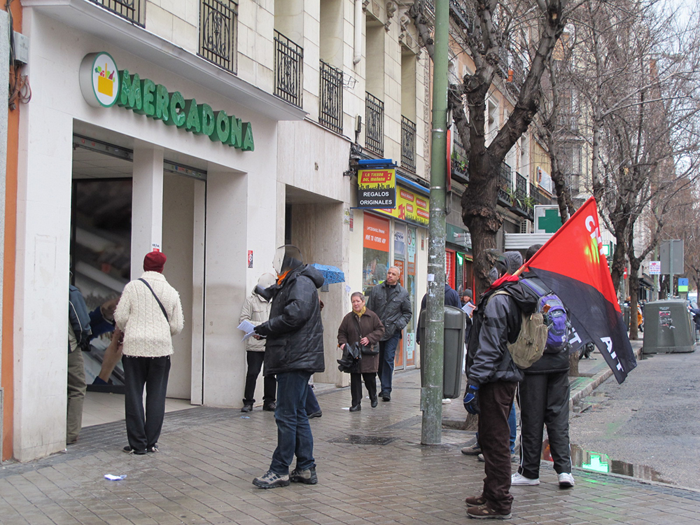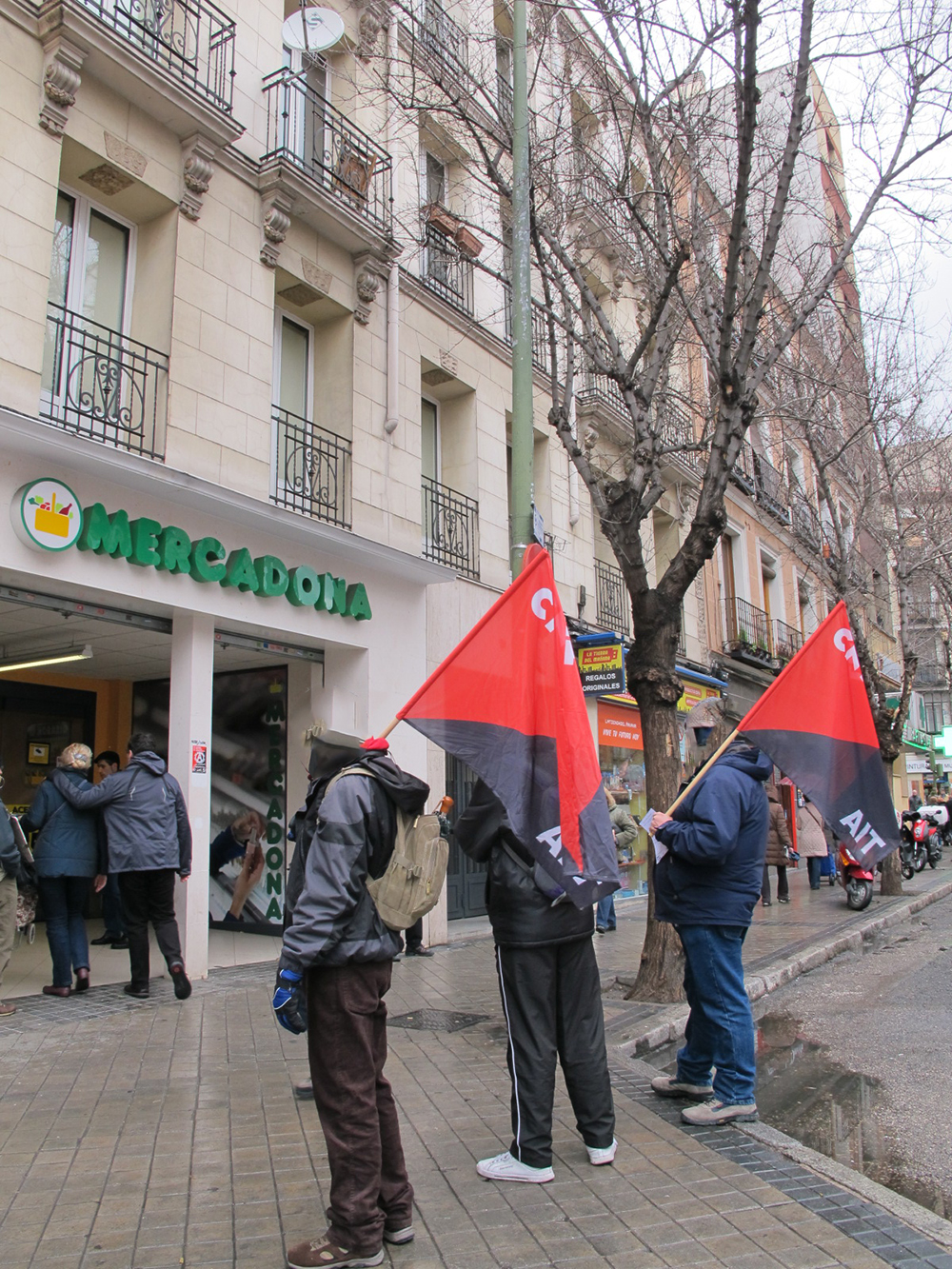 El sábado 18 de Enero una vez más nos concentramos un grupo de compas de la CNT de Madrid para solidarizarnos por los despidos de les compañeres del SOV de Valencia por esta empresa de mafiosos llamada Mercadona.