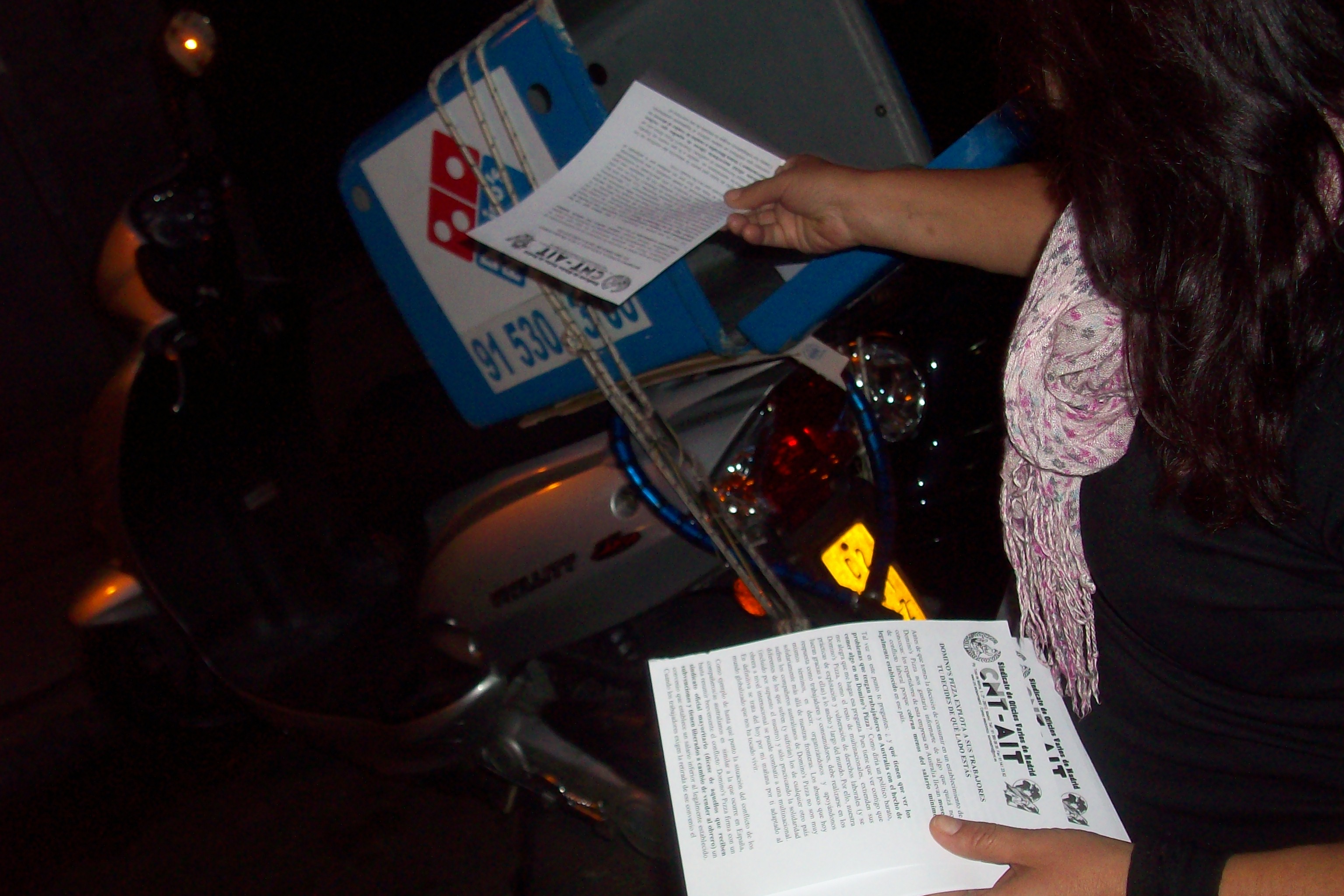 El pasado Sábado día 15 de Septiembre, un grupo de compañeres del Sindicato de Oficios Varios de Madrid, realizamos un piquete informativo en el centro de Madrid, concretamente en la calle Atocha. Durante apróximadamente una hora y media, estubimos informando tanto a les vecines y viandantes de la zona, como a les trabajadores de Dominos Pizza, del conflicto que les compañeres australianos de la Asociación Internacional de Trabajadores, mantienen con esta cadena internacional de comida rápida.