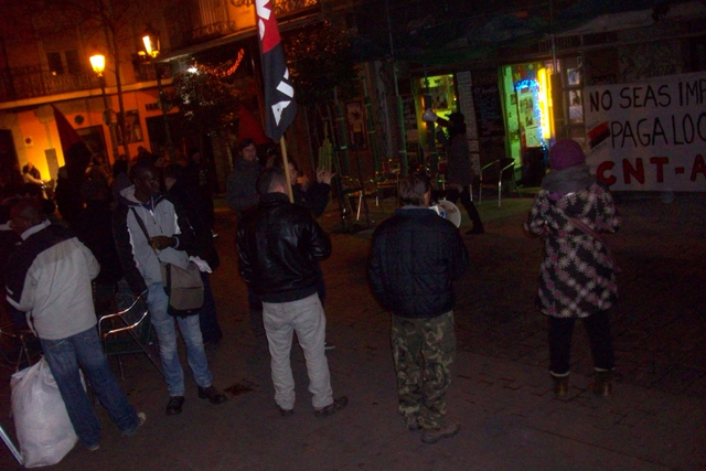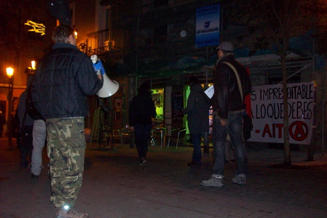 Se lee y distribuye el panfleto y se entonan consignas libertarias en la puerta y en la colindante calle Huertas, muy traficada a esa hora, despertando el interés de numeroses viandantes. Muchos de ellos se quedan en apoyo al piquete. Se denuncian las prácticas del empresario que acosa, explota y despide a sus trabajadores, mantiene a parte de la plantilla en negro y se mete al bolsillo las cotizaciones de todos, etcétera. Van apareciendo algunas patrullas de policía, quedándose a algunos metros de distancia.