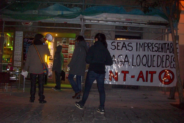 El piquete sigue ante la mirada atónita de los propietarios de los locales aledaños y de los empleados del bar que, si bien no tenían clientes que atender, estaban ocupados en intentar comunicar con el patrón, por lo visto en paradero desconocido. Mientras tanto, otros trabajadores de la zona se solidarizan con nuestro compañero. Ante la “desaparición” del patrón, hemos dejado claro a les trabajadores, vecines, clientes y demás que no nos iremos hasta que “El Imperfecto” pague lo que debe.