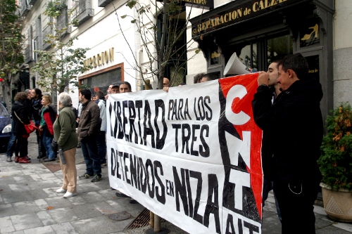 El pasado martes 22 de noviembre, se concentraron unos 50 compañeros y compañeras de CNT-AIT de Madrid, Villaverde y Aranjuez y otros compañerxs y amigxs a que habían acudido, en respuesta a la convocatoria de CNT-AIT Madrid, a las puertas de la Embajada Francesa, para exigir la libertad de nuestros compañeros Xabier, Adrián y Miguel, detenidos por la justicia Francesa en Niza el 1 de Noviembre, coincidiendo con la cumbre del G20, cuando iban de camino para practicar montañismo en los Alpes.