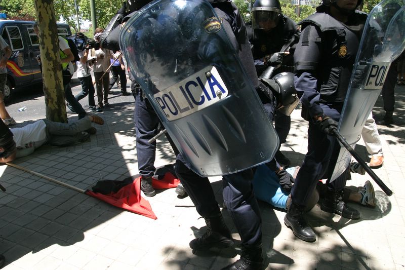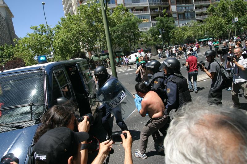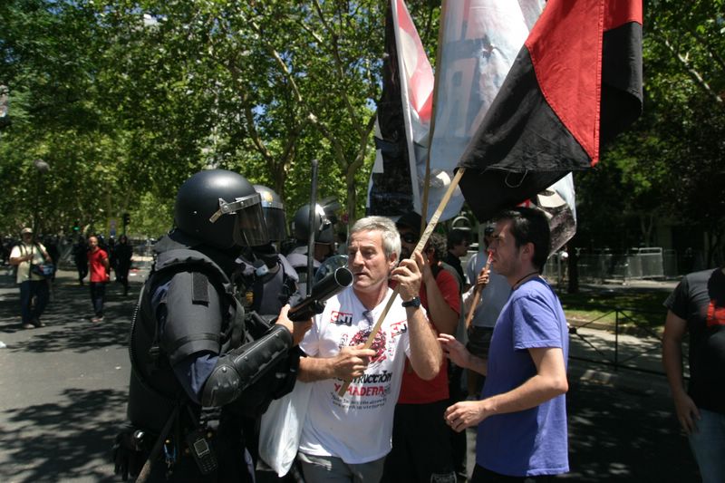 En las fotos vereis que la policía carga contra unxs compañerxs que portan una pancarta y banderas de la CNT, algo que fueron haciendo a otros miembros de las bases de los sindicatos, colectivos e individualidades presentes. Hay que decir, por decirlo de alguna manera, que en la cabecera había una parte de la manifestación que estaba embobada con el discurso oficial de CCOO y UGT y los mineros de las marchas ( la mayoría) como si nada ocurriera en la parte de atrás, donde se estaba produciendo cargas y detenciones indiscriminadas y selectivas de lo asistentes a la manifestación.