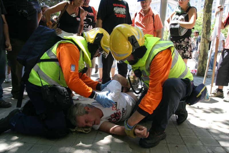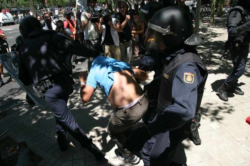 Como veis en la secuencia de fotos la actitud veligerante de los atidisturbios se hace latente con lxs compañerxs cenetistas a quienes están agrediendo y en ese transcurso, cae un compañero bastante maltrecho debido al sock y a los golpes. A todo esto , golpean y detienen a un compañero " no estoy seguro que sea de la CNT" por que a su lado se ve que hay una gorra roja que pudiera ser de CCOO ( en otras fotos se ve mejor), por lo que podría ser alguien sensible a lo que pasó y no un compañero de nuestra organización.