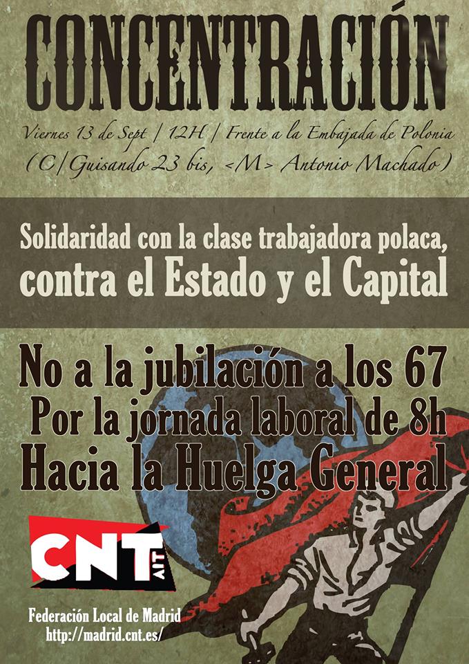 Los compañeros de la ZSP, sección polaca de la AIT, nos piden que nos solidaricemos con los trabajadores polacos cuyo gobierno pretende, entre otras cosas ampliarles la jornada laboral hasta 13 horas, en respuesta la FL de Madrid convoca una concentración este viernes frente a la embajada polaca.