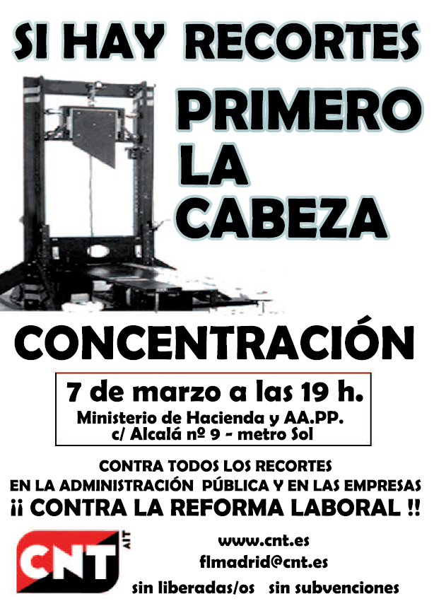 CNT-AIT Madrid convoca el 7 de marzo a las 19h, ante el ministerio de Hacienda y Administraciones Públicas, concentración contra los recortes laborales y sociales en la administración pública y contra la reforma laboral