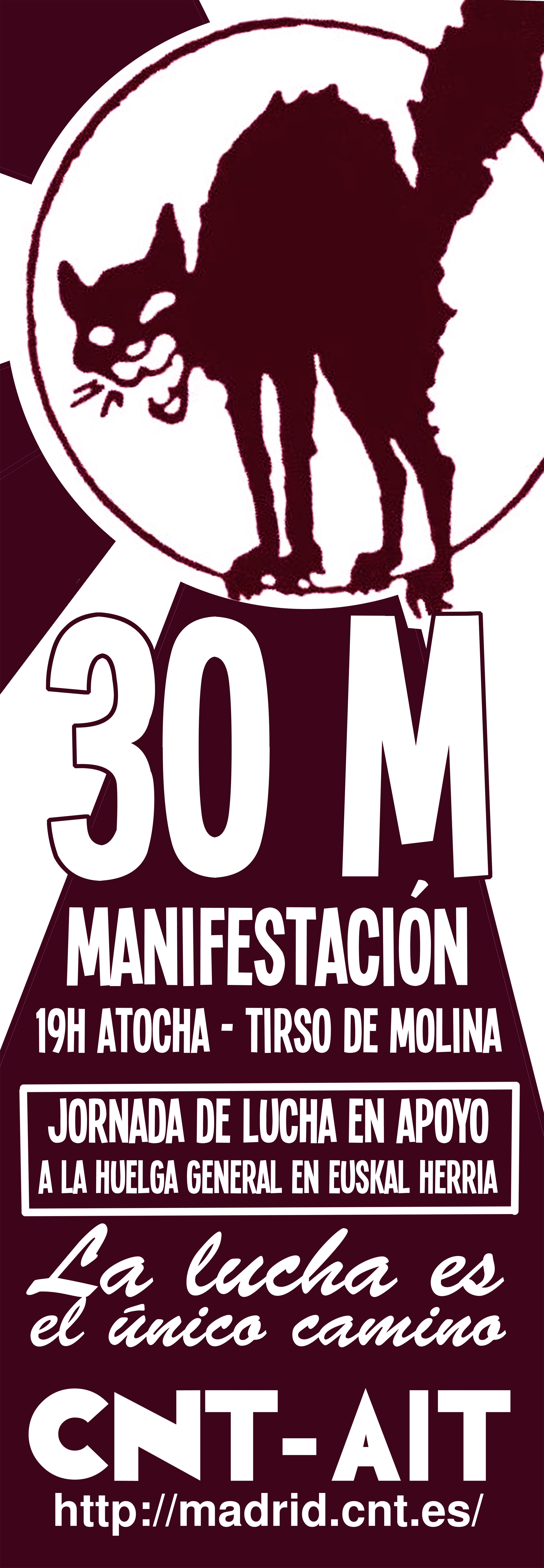 Bajo el lema "los derechos no se negocian se conquistan" la CNT convoca al pueblo trabajador de Madrid a solidarizarse con la huelga general que el día 30 de Mayo tendrá lugar en Euskalherria. A las 19h partirá una manifestación desde Atocha y finalizara en la plaza de Tirso de Molina donde se dará un mitin para animar a romper el cerco en que el sistema capitalista nos tiene metidos.