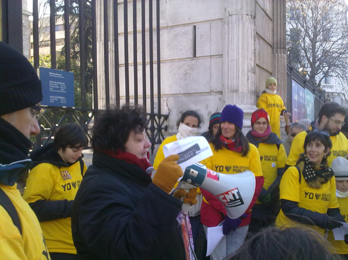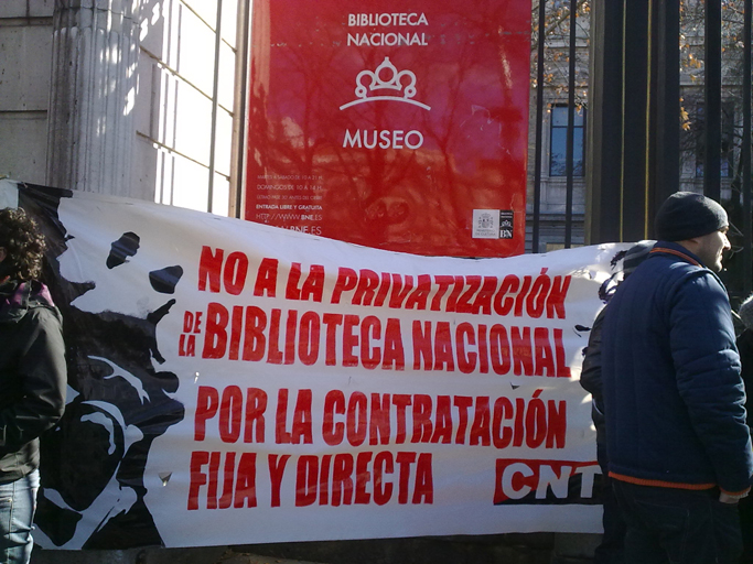 En la mañana del 4 de febrero, la CNT de Madrid acudió frente a las puertas de la Biblioteca Nacional para exigir una vez más la readmisión de las compañeras Marta, Begoña y Sara, despedidas de esta institución por denunciar su situación de cesión ilegal, y por la contratación fija y directa de los/as más de 400 trabajadores/as subcontratados/as cuyos puestos de trabajo, además de precarios, cuestan a la Biblioteca Nacional un 40% más que si se tratase de una contratación directa.