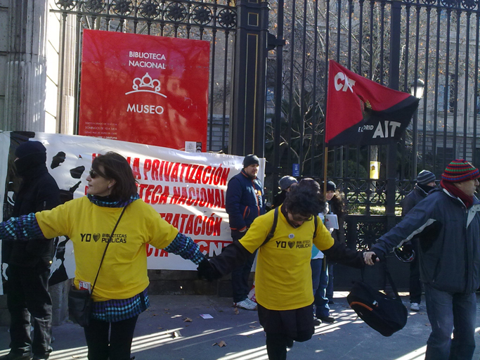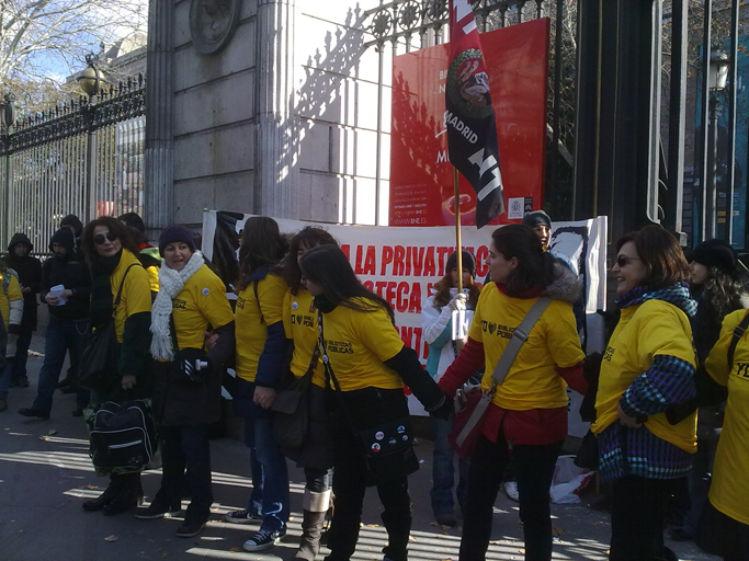 Este sábado no estuvimos solos/as en nuestra lucha, acompañamos y nos acompañó una Marea Amarilla contra los recortes y por la defensa de las bibliotecas públicas, convocada por la Plataforma Contra el Préstamo de Pago en las Bibliotecas. Esta jornada de lucha y solidaridad no fue ninguna sorpresa para nadie; los recortes y cierres de bibliotecas que estamos sufriendo en los últimos tiempos, es un hecho que no podemos seguir tolerando y la cantidad de gente que acudió a la convocatoria es tan sólo una muestra de la necesidad de preservar una cultura libre y gratuita para todos y todas. La Marea Amarilla leyó su manifiesto y se abrazó a la Biblioteca Nacional. Aunque nosotros/as ya habíamos decido no abrazar a una institución que nos explota y nos despide, sí que abrazamos la iniciativa de la Marea Amarilla y a todas y cada una de las personas solidarias que estuvieron allí defendiendo a las bibliotecas y que nos mostraron su solidaridad.