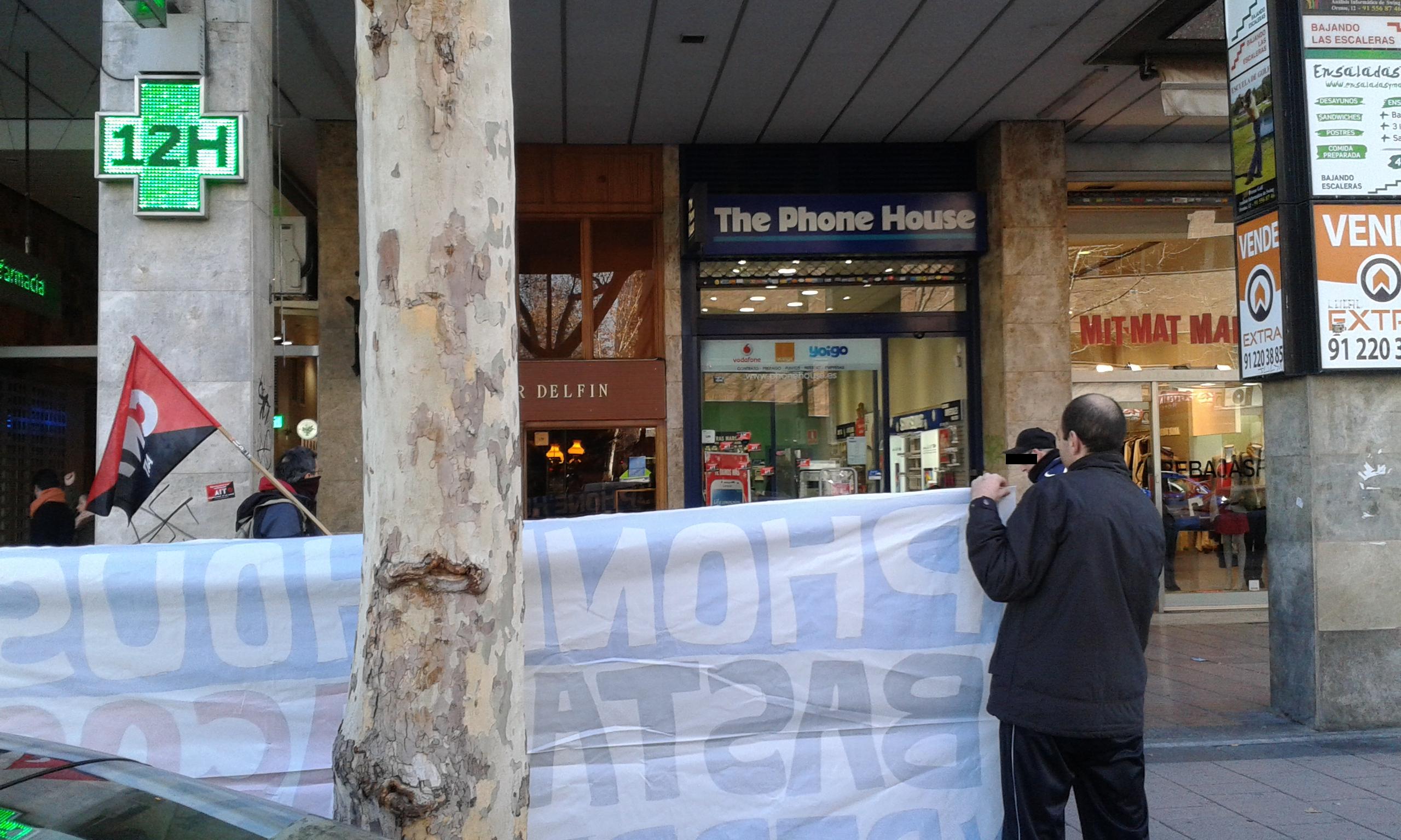Por ello seguimos adelante con múltiples acciones, entre las que están los piquetes informativos como el que se realizó el pasado sábado en la tienda situada en la c/ Orense 12 de Madrid. Informando a clientes de las prácticas explotadoras de esta empresa y pidiendo que no consuman en ella, e informando a los trabajadores/as de que tienen una organización donde acudir para unirse y luchar contra esa opresión mezquina de Phone House.
