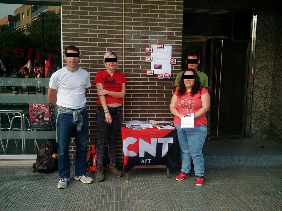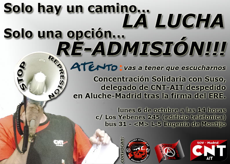 Alrededor de las 14:30 horas militantes del Sindicato de Transportes, Enseñanza y el Sindicato de Oficios Varios de la Federación Local de la CNT-AIT madrileña se dieron cita en Aluche para seguir con las reivindicaciones ante el despido del trabajador Jesús Martínez (Suso) y delegado sindical de CNT-AIT enAtento Madrid.