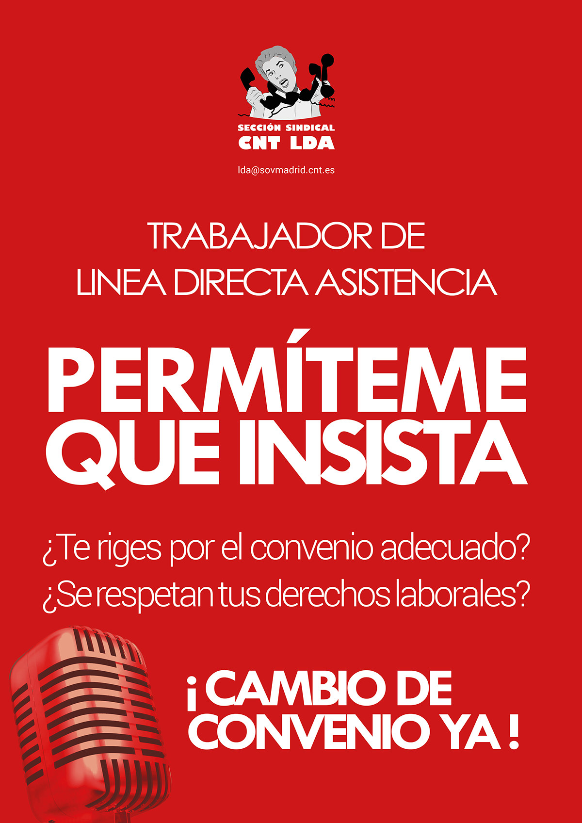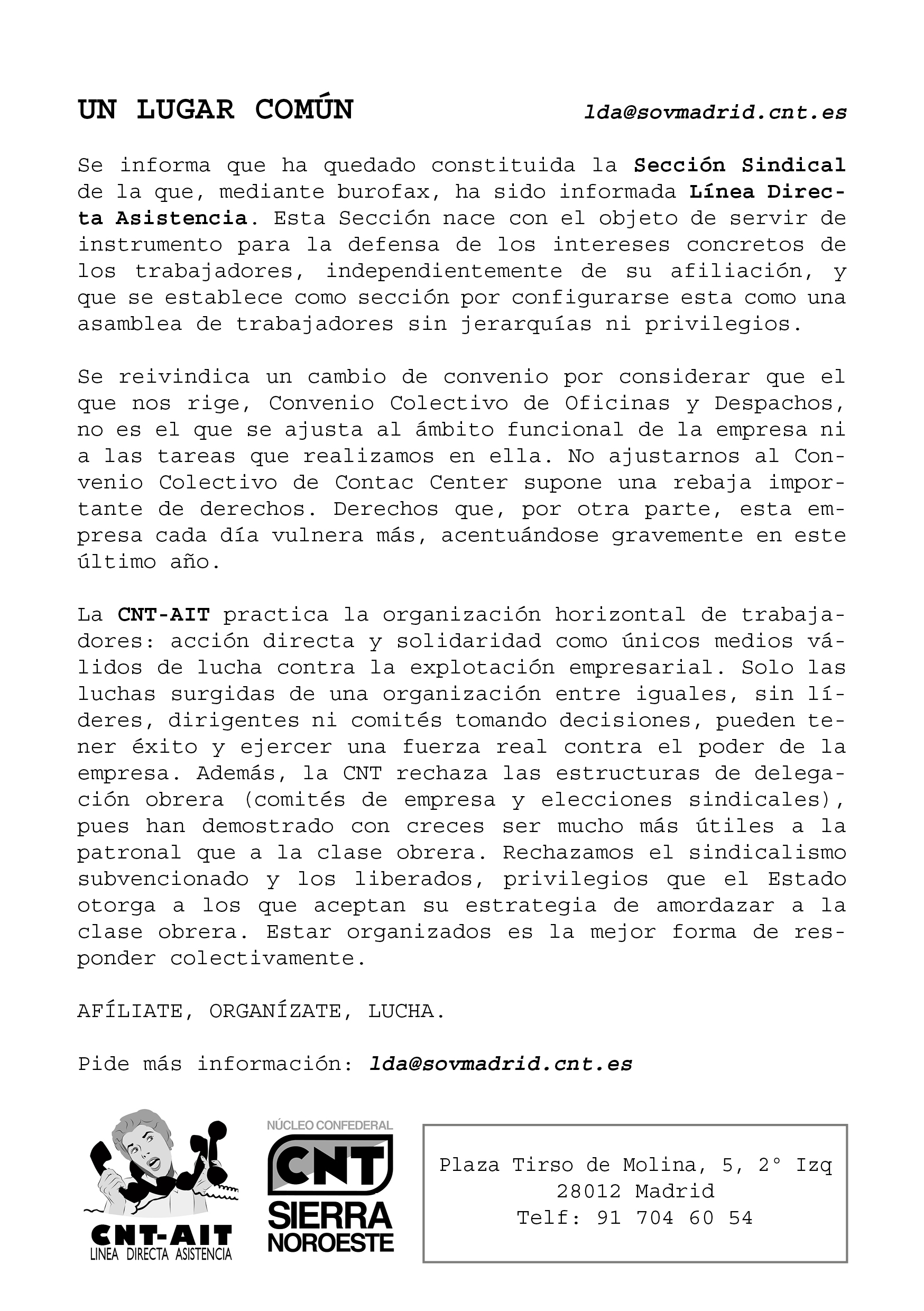 En el mes de febrero se ha constituido la Sección Sindical de CNT-AIT en la empresa Línea Directa Asistencia con sede en Parque empresarial El Plantío, Calle Ochandiano, 418, Edificio 12 en Madrid. Se crea ante la necesidad de luchar por la aplicación de un convenio adecuado para el sector, actualmente nos regimos por el Convenio Colectivo de Oficinas y Despachos cuando entendemos que, debido al ámbito funcional de la empresa así como a las funciones que realizamos en ella, deberíamos regirnos por el Convenio Colectivo de Contact Center.