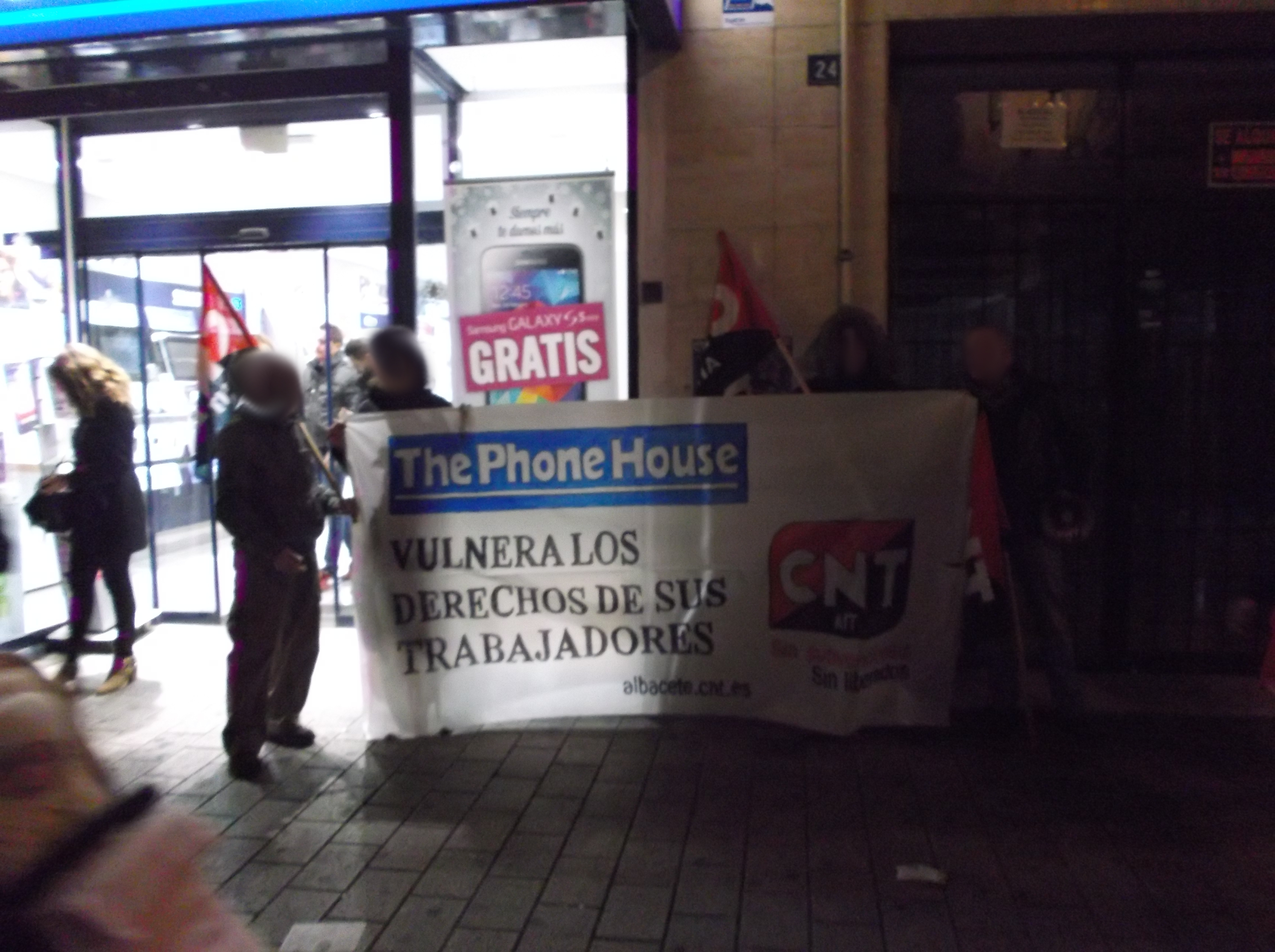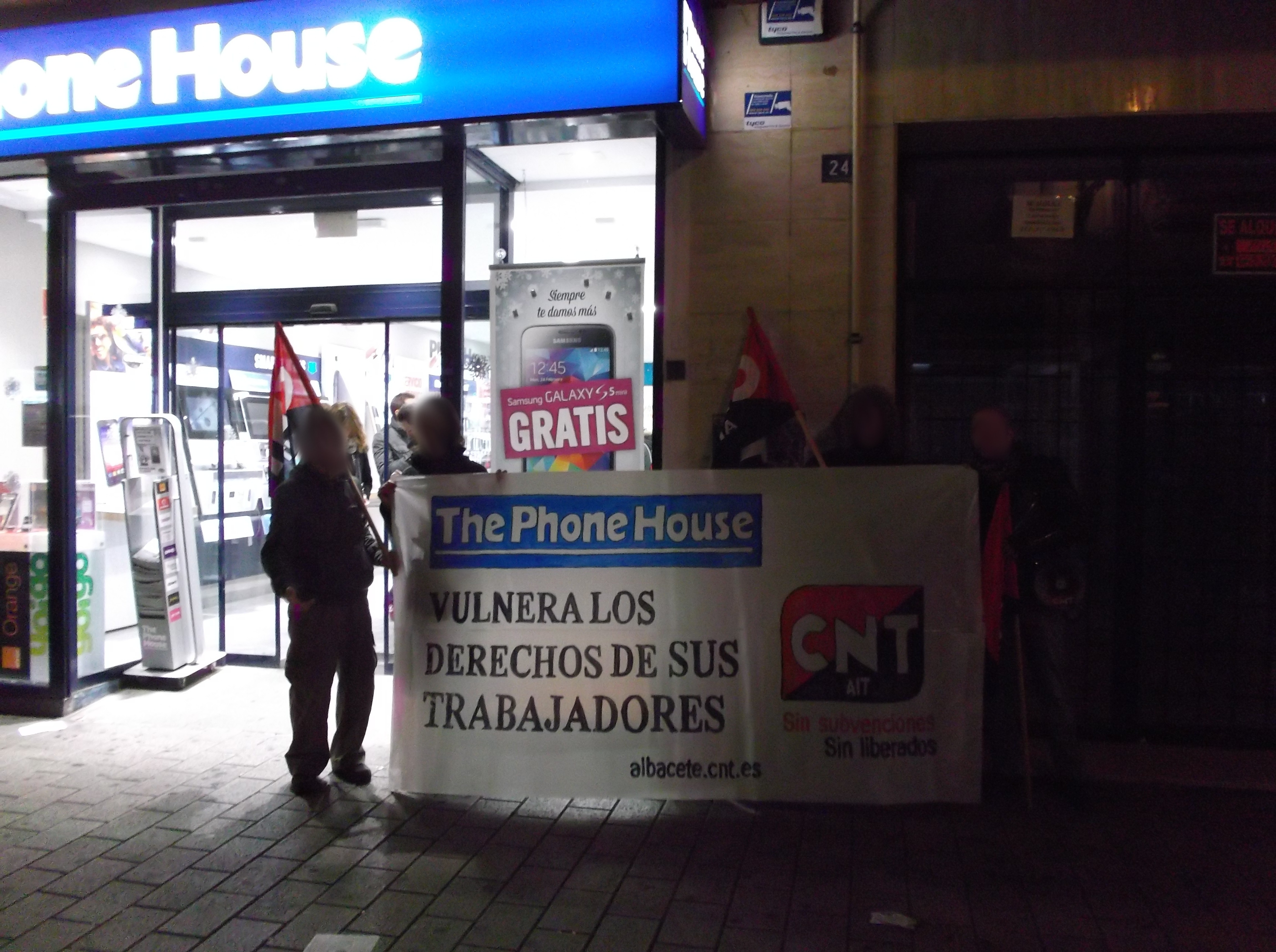 El Sindicato de Oficios Varios de Albacete de la CNT-AIT realizó el día 3 de enero un piquete informativo en la tienda de The Phone House, que tiene esta empresa en la C/ Mayor de Albacete, en solidaridad con la campaña estatal de lucha contra The Phone House que han lanzado las diferentes secciones de la CNT en España (Madrid, Terrassa, Manresa, Sabadell y Barcelona).