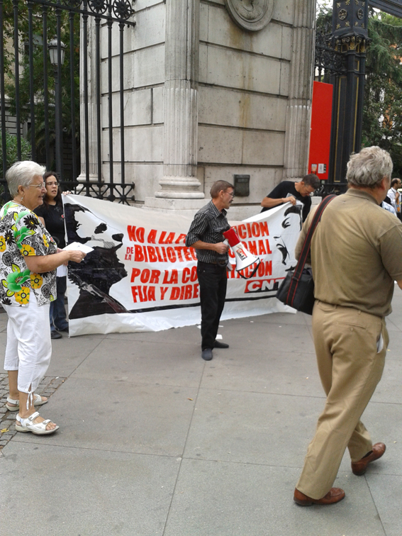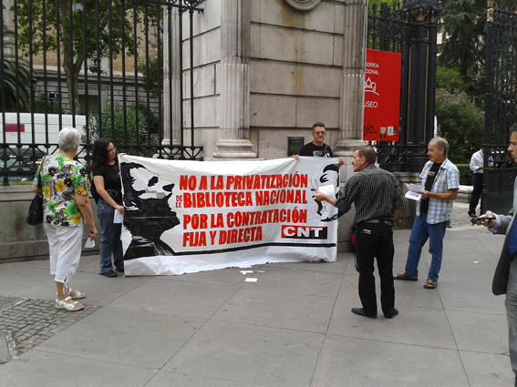 Hemos vuelto frente a las puertas de la Biblioteca Nacional, soportando el acoso del personal de seguridad de esta institución que hoy nos ha impedido entrar al patio, con una petición de contratación directa del personal externo como solución a los recortes y los despidos en las bibliotecas públicas y, concretamente, en la Biblioteca Nacional que mantiene una plantilla de más de 400 trabajadores subcontratados.
