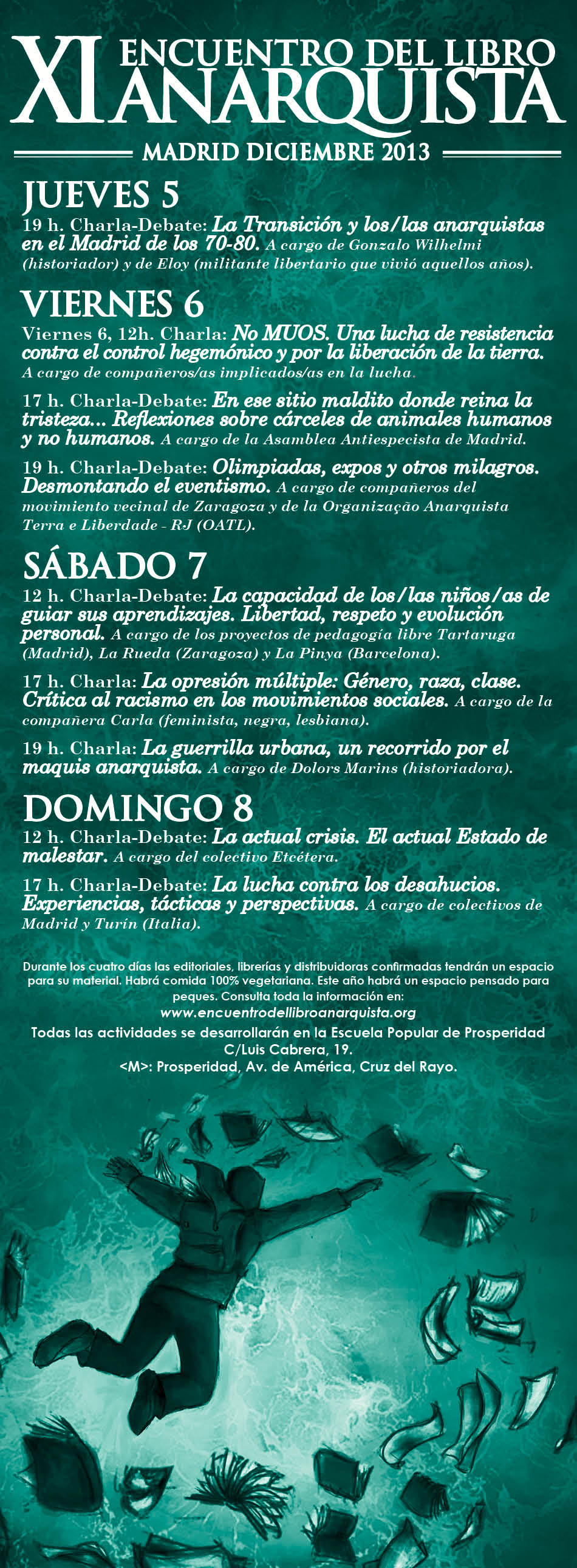 Un año más y ya van 11, las personas que venimos organizando el Encuentro del Libro Anarquista de Madrid hemos decidido volver a hacer posible esta confluencia de intercambio de material, experiencias y comunicación que apuesta por una forma diferente de entender la realidad y practicar la subversión. Como cada año, tendrá lugar en la Escuela Popular de Prosperidad (c/ Luis Cabrera, 19) durante los días 5, 6, 7 y 8 de diciembre.